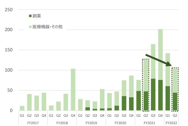 前述したサービスのローンチがあり、FY21から医療事業は急成長しているものの、前期4Qをピークに減少傾向にあります。