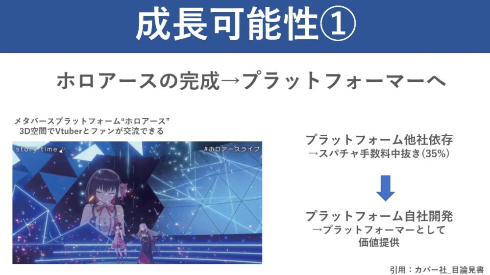 ただし、Vtuber数の人気度やホロアースの開発を考えると、成長性はカバーに軍配が上がるでしょう。