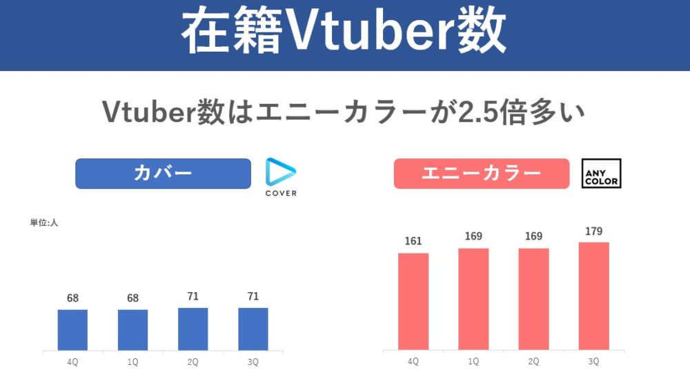 Vtuber数はエニーカラーのほうが2.5倍ほど多いです。