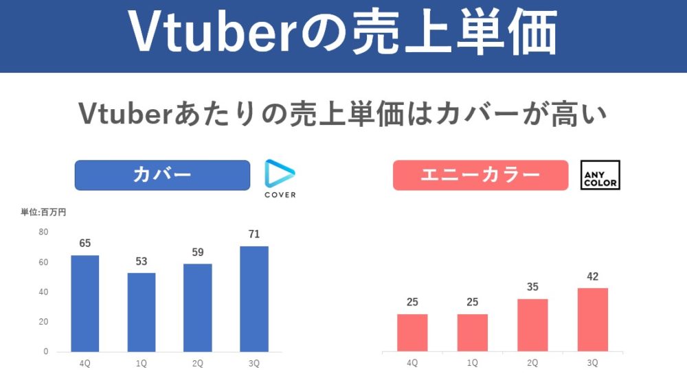 Vtuber数はエニーカラーのほうが多いですが、1人あたりの売上単価はカバーのほうが高いことが分かりました。