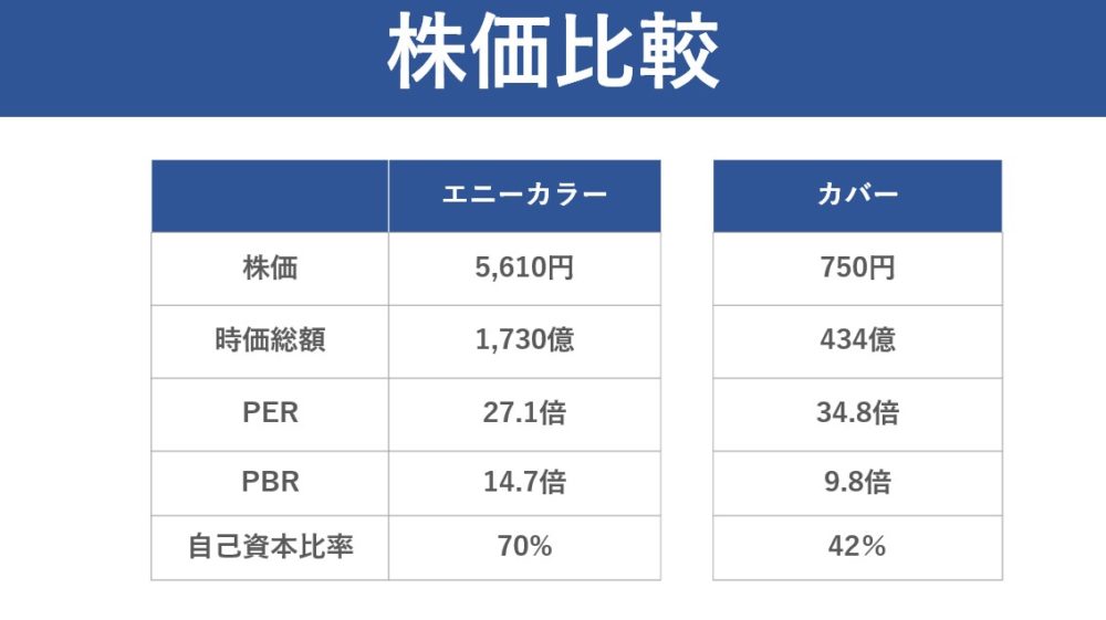時価総額はエニーカラーが3倍以上ですが、PERで見るとエニーカラーのほうが割安になっています。