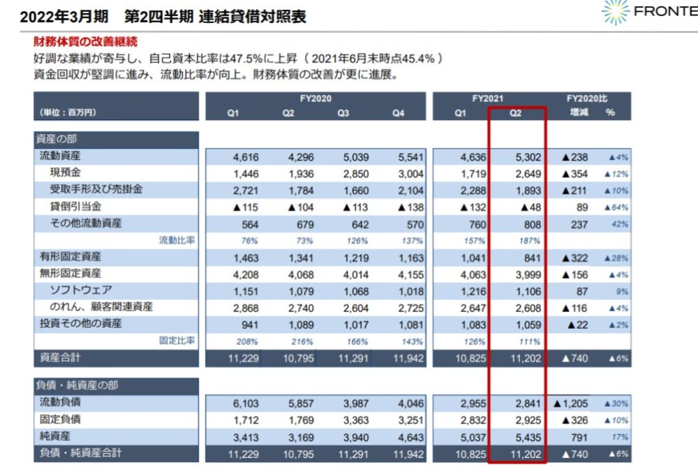自己資本率は47,5%に上昇し、流動比率(流動資産÷流動負債)も180%近くあり健全です