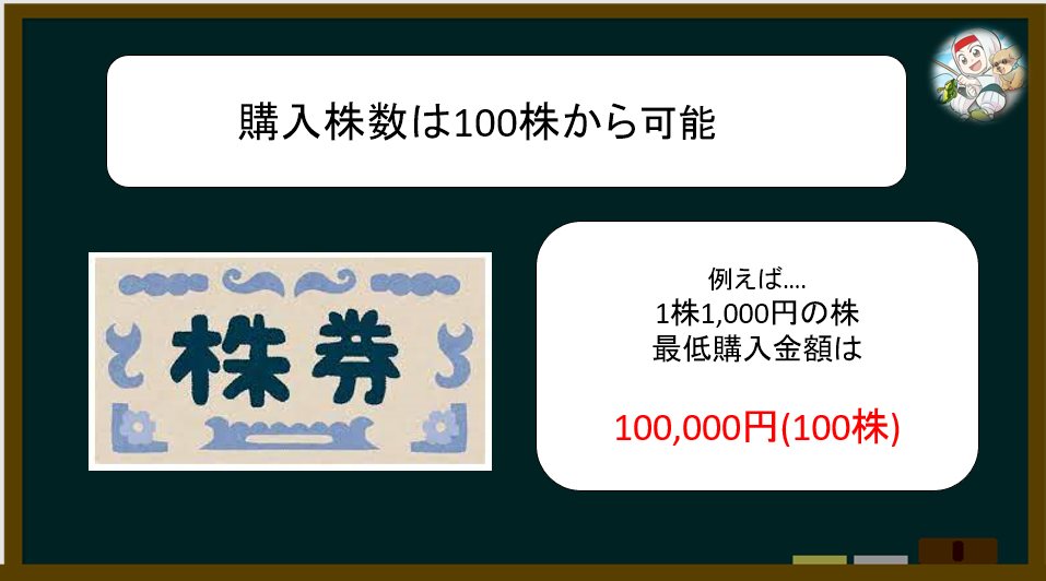 例えば、1株1,000円なら購入するには最低10万円必要となります。