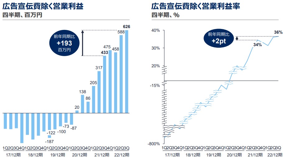 また広告費を除いた営業利益は右肩上がりに伸長しています。