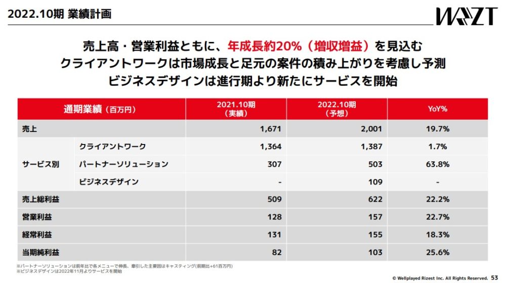 売上/利益は20%成長を見込んでいますが、事業別にみるとメイン事業のクライアントワークが+1.7%とかなり低調です。